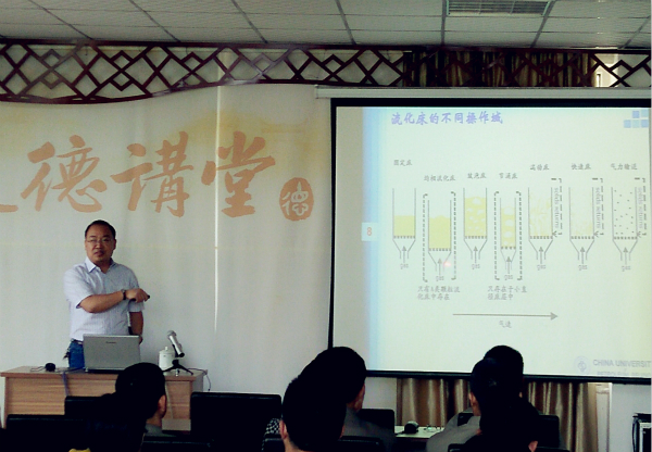 張教授首先講解了“氣-固流態(tài)化”基本概念,從理論的角度介紹了流態(tài)化過程對非均相反應過程的影響及流化床不同的流化形式,其后張教授把流態(tài)化的相關知識由理論延伸到實際生產應用,著重講解了在催化裂化中的應用,并且講解了氣固分離設備和分布器在實際應用中的作用。此外,還針對催化裂化裝置常見的催化劑跑損、設備磨損等問題進行了深入分析。
