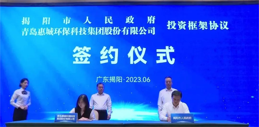 6月18日,青島惠城環??萍技瘓F股份有限公司與揭陽市人民政府在揭陽市區簽署投資框架協議,共同促進石化產業綠色低碳循環利用,助推揭陽經濟高質量發展。揭陽市市委副書記、市長支光南,惠城環保創始人、首席技術官張新功出席簽約儀式并上臺鑒簽。