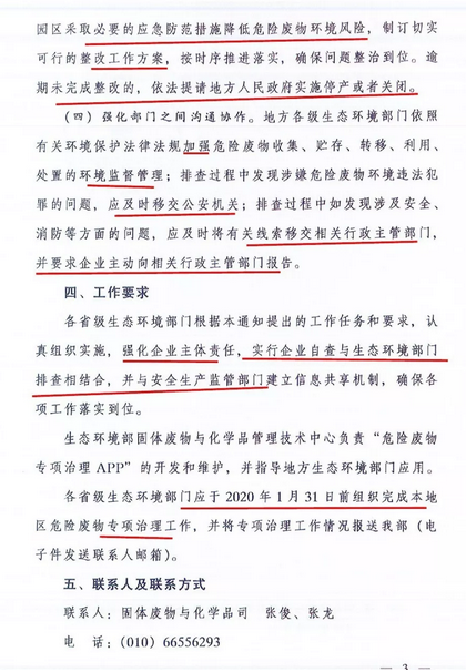 《通知》要求今年年底前,在全國范圍內排查化工園區、重點行業危險廢物產生單位、所有危險廢物經營單位的危險廢物環境風險,消除環境風險隱患。